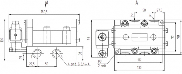 Четырехлинейный, двухпозиционный с односторонним электропневматическим управлением с ручным дублированием и пружинным возвратом в исходное положение. Конструкция распределительного устройства: плоский притёртый золотник |