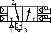 Исполнение Трехлинейный, двухпозиционный, сдвоенный с пневматической блокировкой и пневматическим возвратом. Конструкция распределительного устройства: клапанного типа