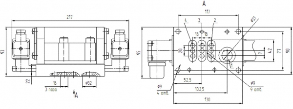 Четырехлинейный, двухпозиционный с двухсторонним электропневматическим управлением и с ручным дублированием. Конструкция распределительного устройства: плоский притёртый золотник |